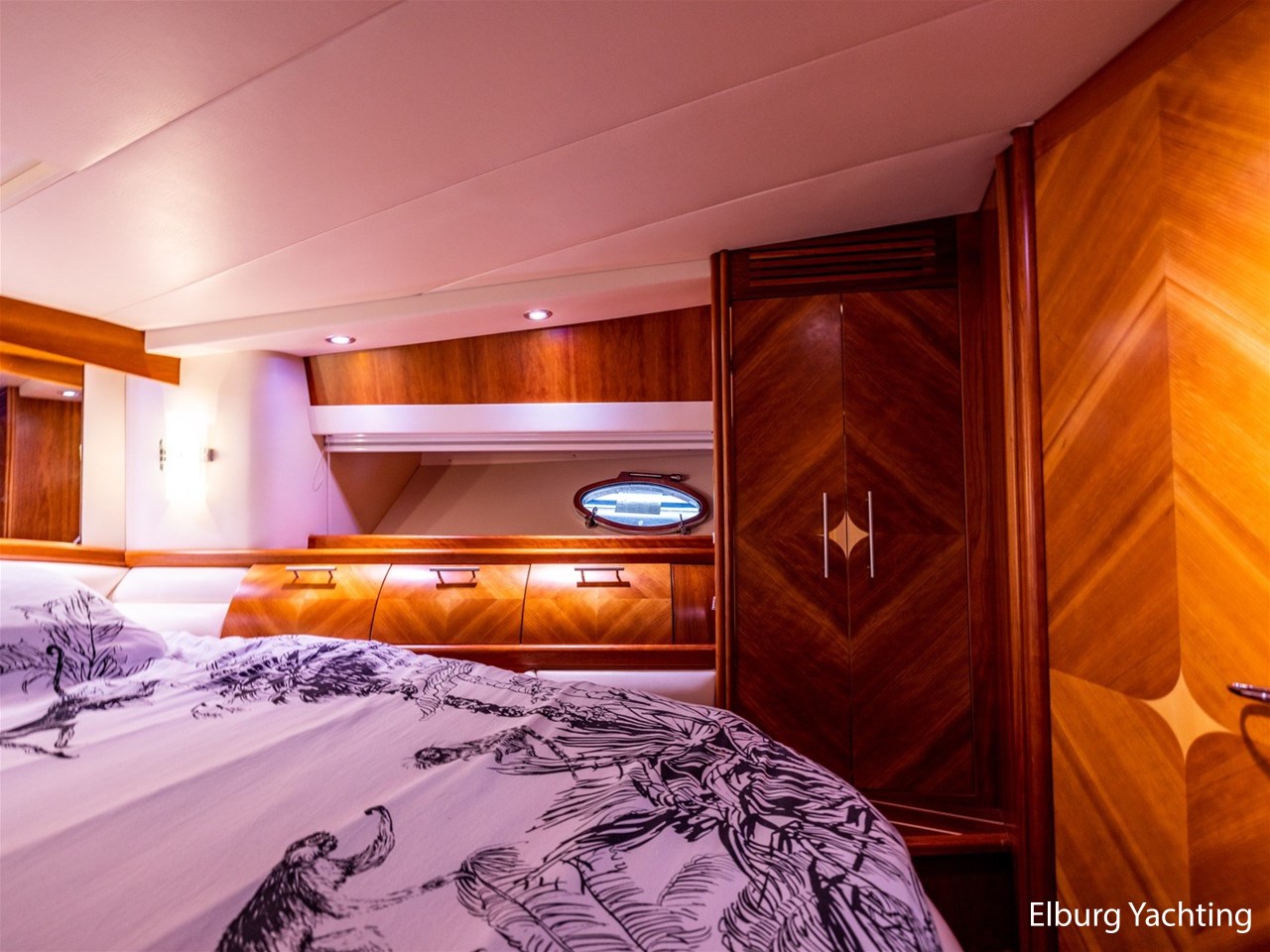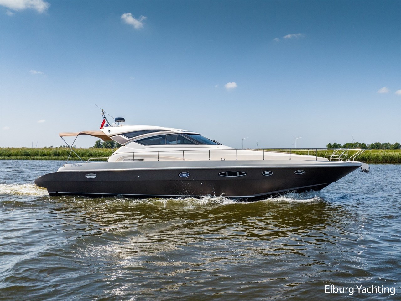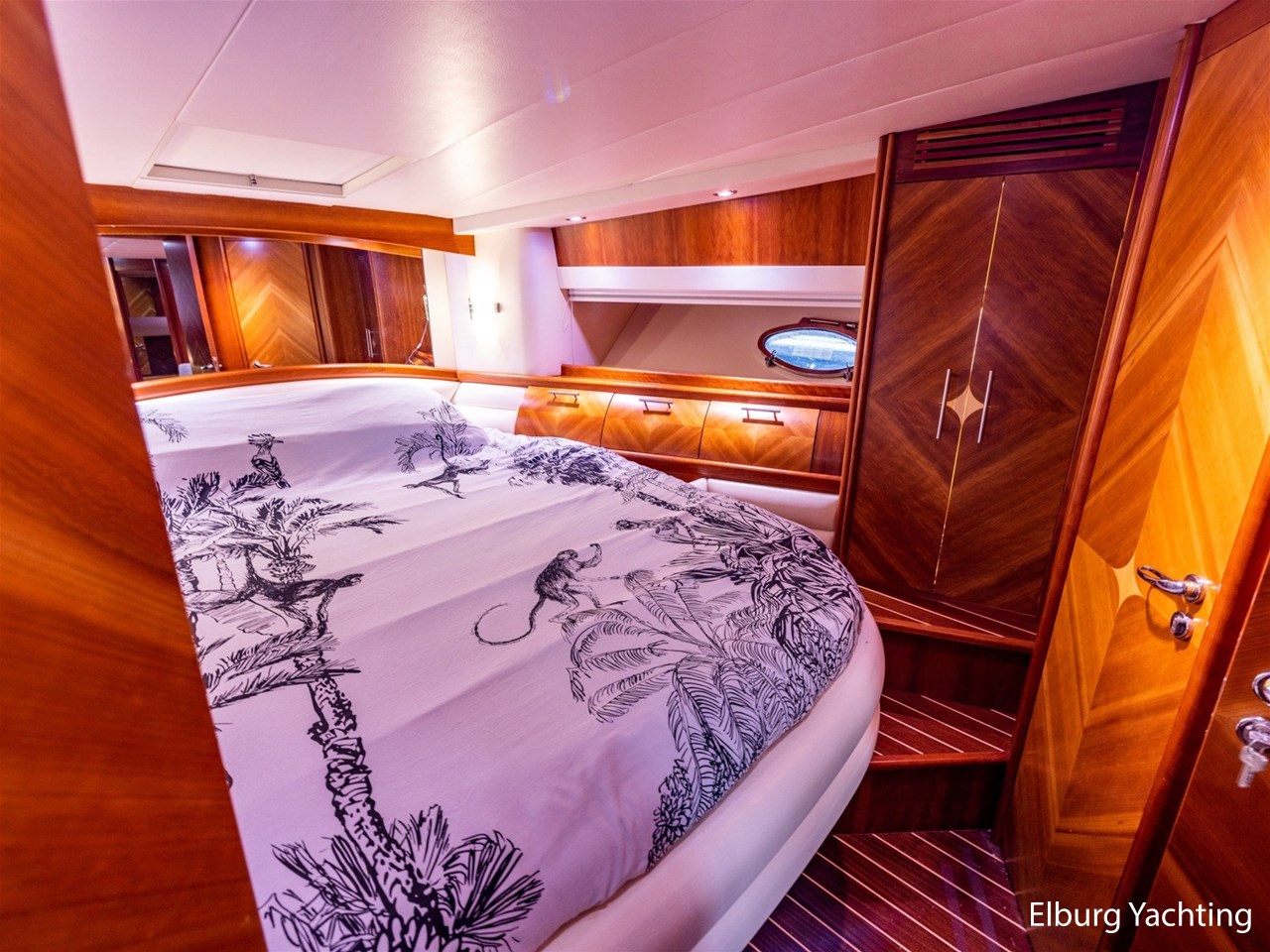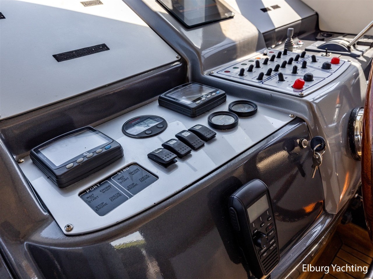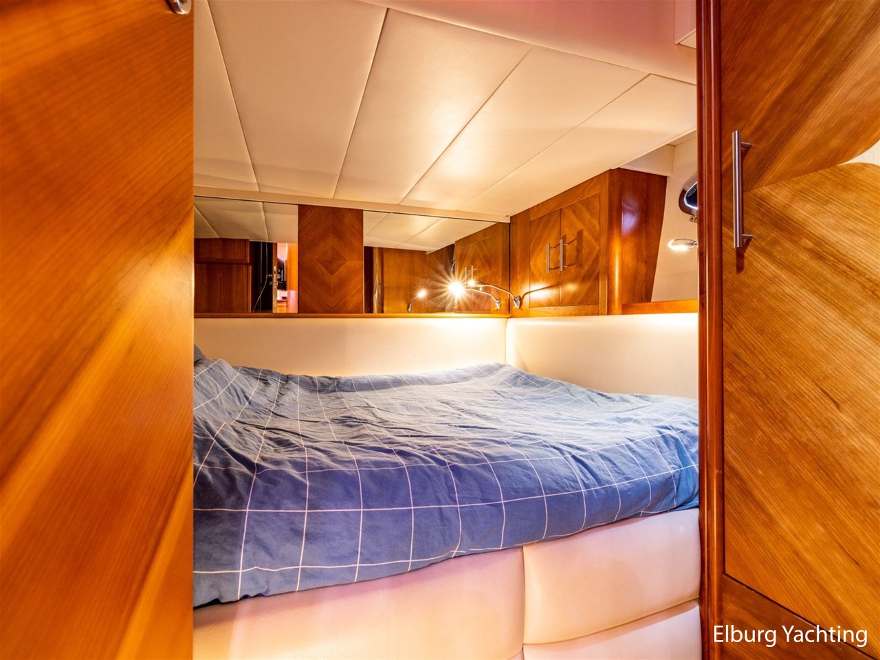 The Cayman 52 Hardtop is a truly sporty all-rounder. The wheelhouse can be fully enclosed with a canopy or insect screen. The helm station, wet bar with sink, grill and fridge, and the spacious U-shaped seating area are all located on a single level. The large electric sliding roof brings the outdoor feeling inside. The open cockpit is generously laid out with a fixed bench and matching cushions. A cockpit hatch provides access to the technical area with additional storage space. Below deck, there are no fewer than three cabins offering up to six berths, along with two separate toilet and shower compartments. This Cayman 52 is equipped with features including: a hydraulically operated gangway on the aft deck, dinghy bracket and launching system, bimini top over the aft deck, cockpit lighting, stainless steel fender holders, two storage hatches in the foredeck, a large sunbed on the bow, high stainless steel guard rails all around, high-quality Italian wood interior, easily accessible technical systems, tanks with inspection hatches, trim tabs, Philips HUE interior lighting, and a trawling mode (low-speed control at idle). Furthermore, a stern thruster was recently installed, and the bilge pump, cover (2024), and service batteries have been renewed.