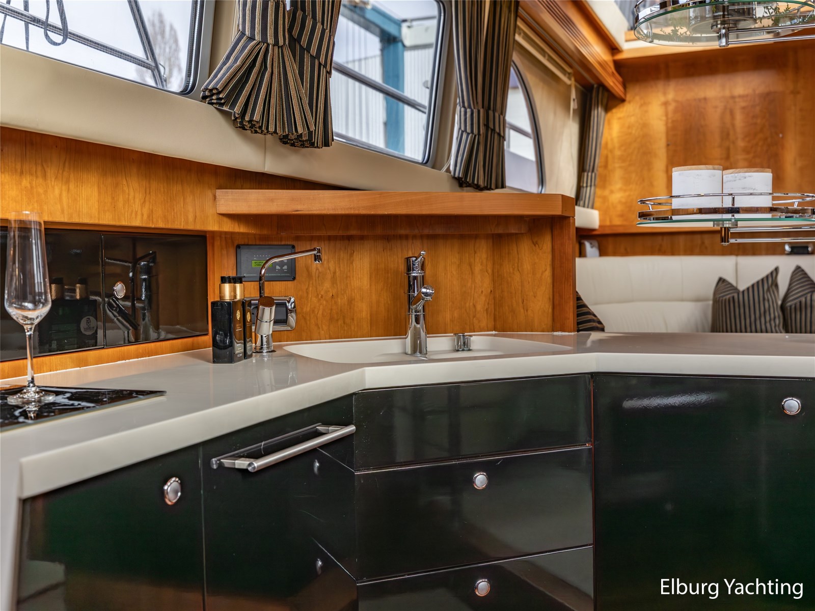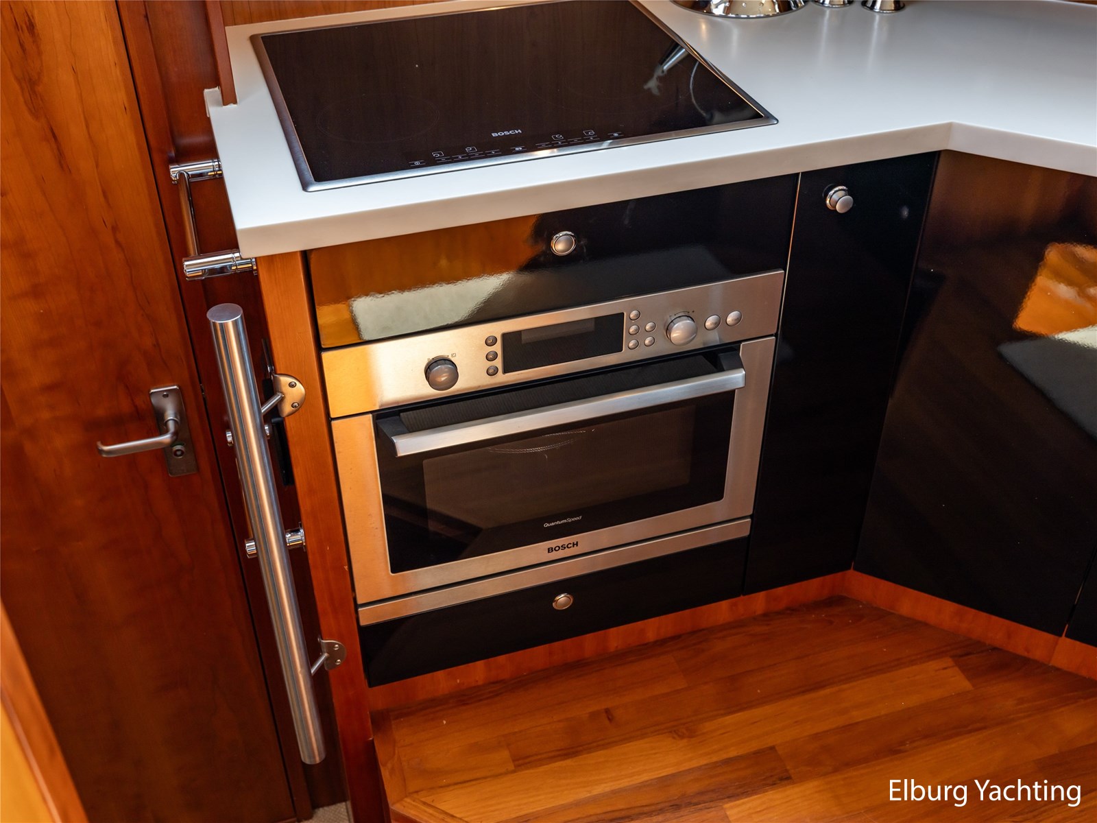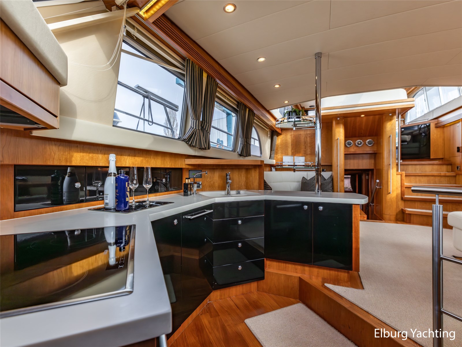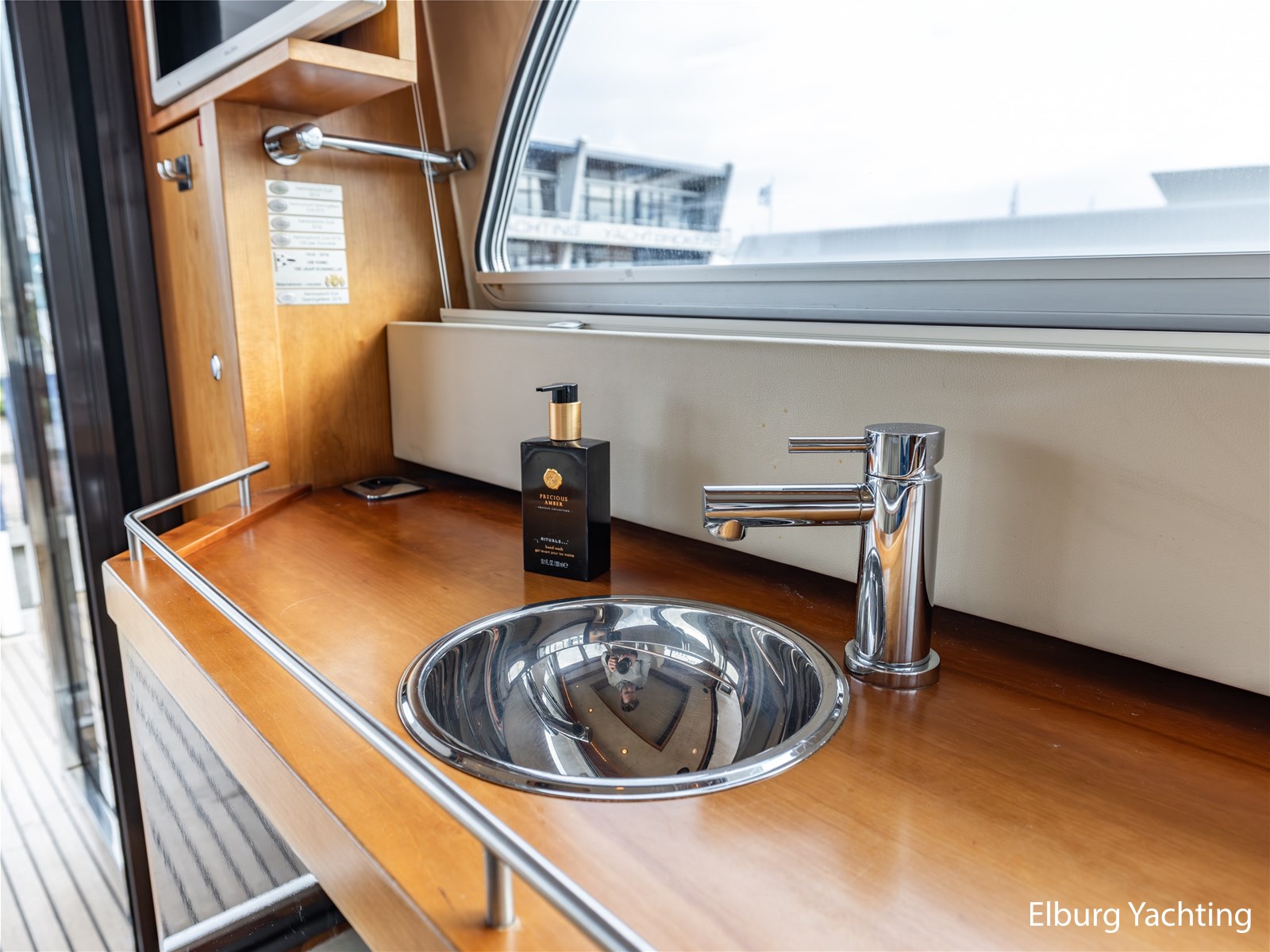 From the wheelhouse, a small level change leads to the spacious salon, finished in teak wood with cream-white leather upholstery and generous natural light from the large windows. The salon is elegantly illuminated with built-in LED lighting and features a flat-screen TV, ensuring relaxation on board. Just a few steps down from the salon, you’ll find the fully equipped galley, featuring a Corian countertop, ceramic cooktop, extractor hood, Bosch oven, combination microwave, and double refrigerator. Everything is in place for full onboard living and cooking.