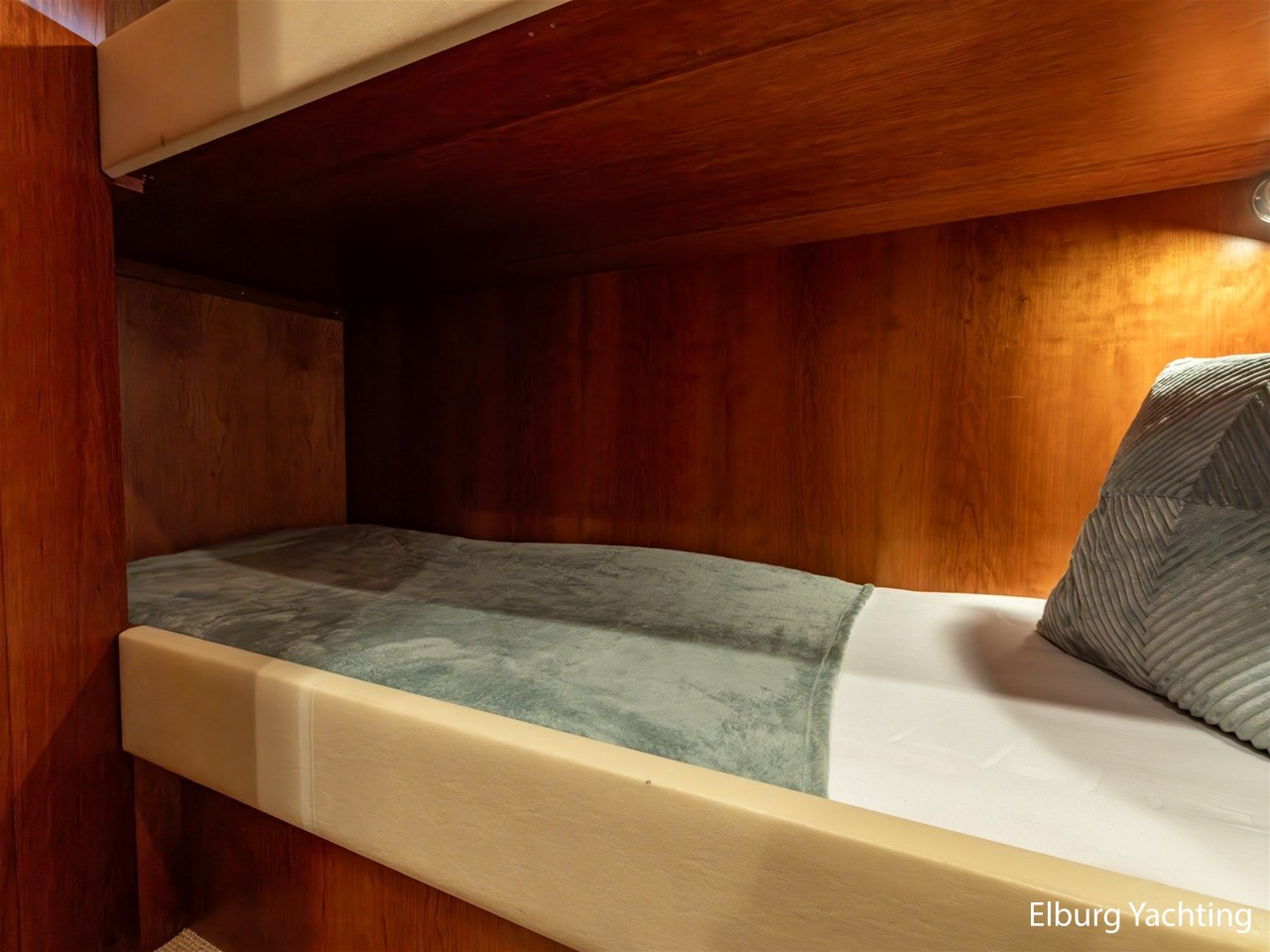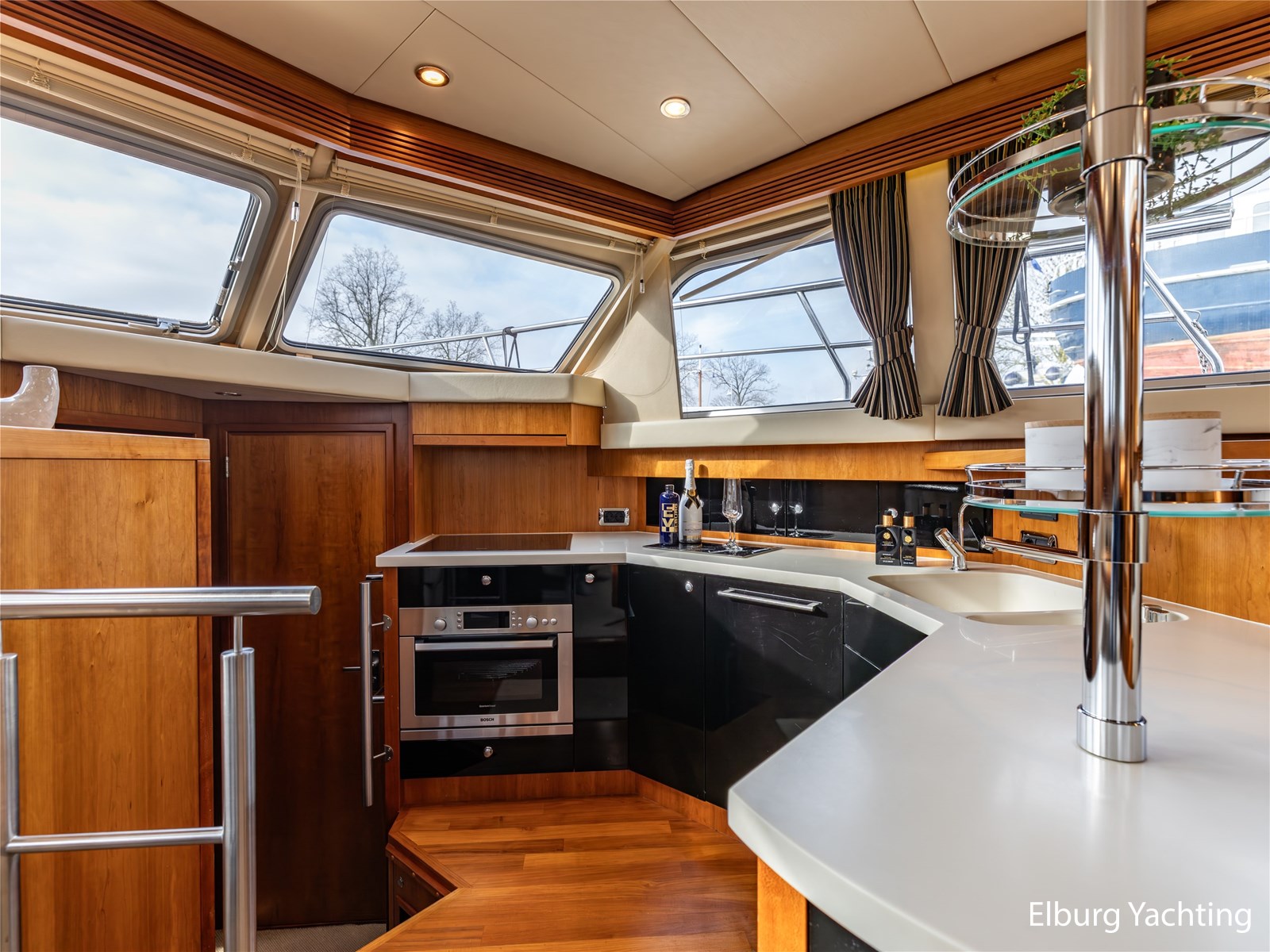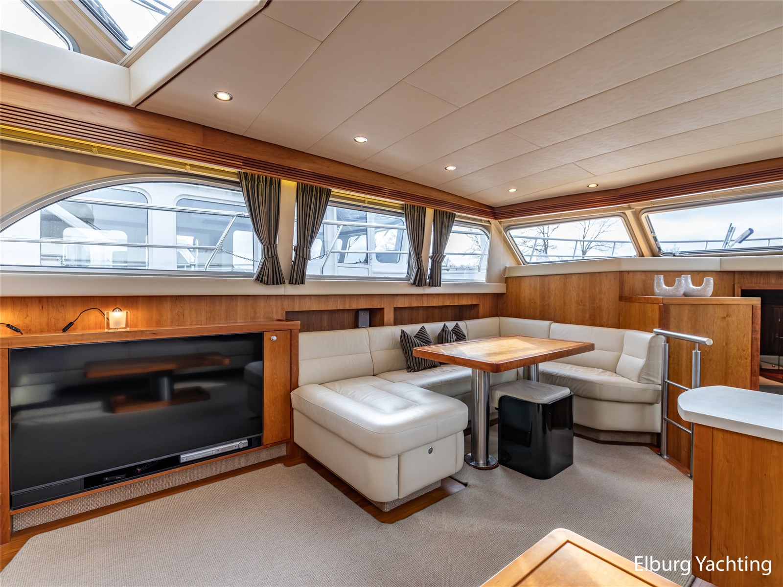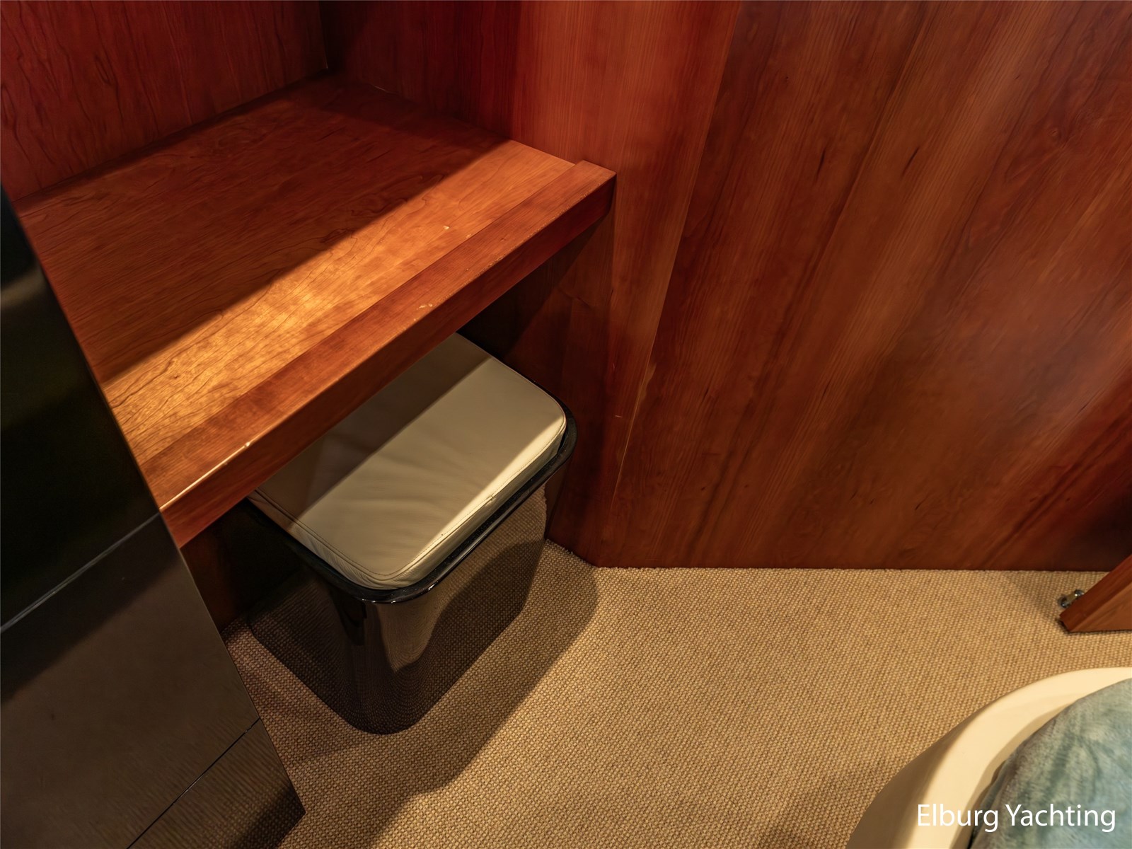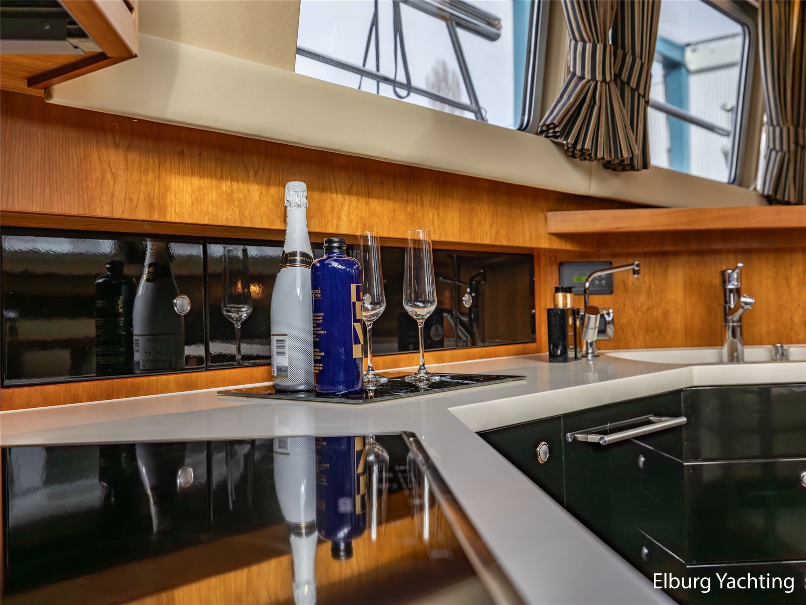 From the wheelhouse, a small level change leads to the spacious salon, finished in teak wood with cream-white leather upholstery and generous natural light from the large windows. The salon is elegantly illuminated with built-in LED lighting and features a flat-screen TV, ensuring relaxation on board. Just a few steps down from the salon, you’ll find the fully equipped galley, featuring a Corian countertop, ceramic cooktop, extractor hood, Bosch oven, combination microwave, and double refrigerator. Everything is in place for full onboard living and cooking.