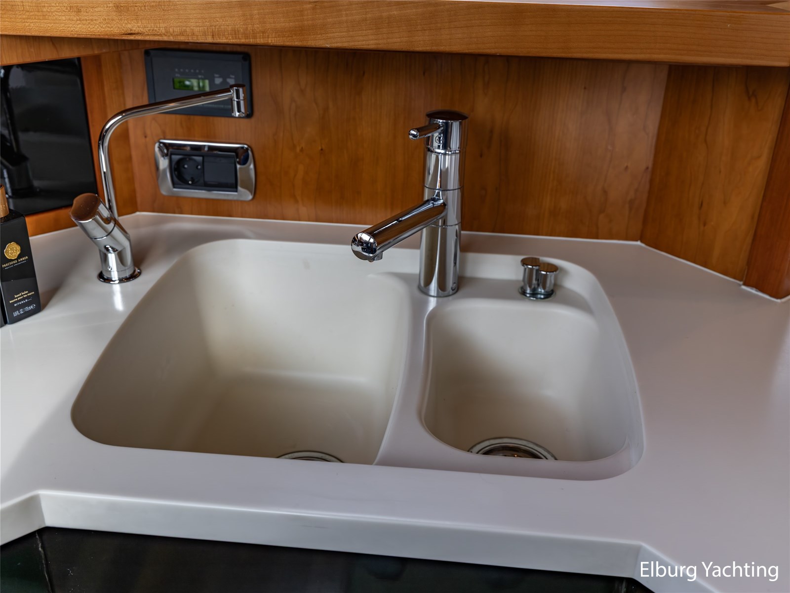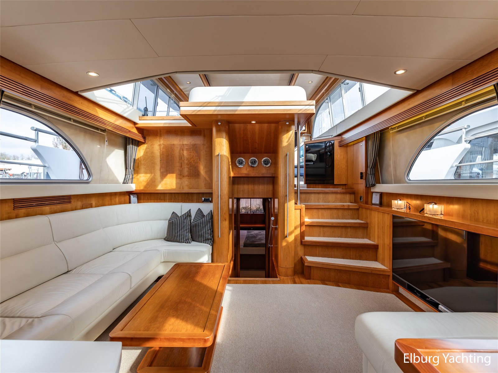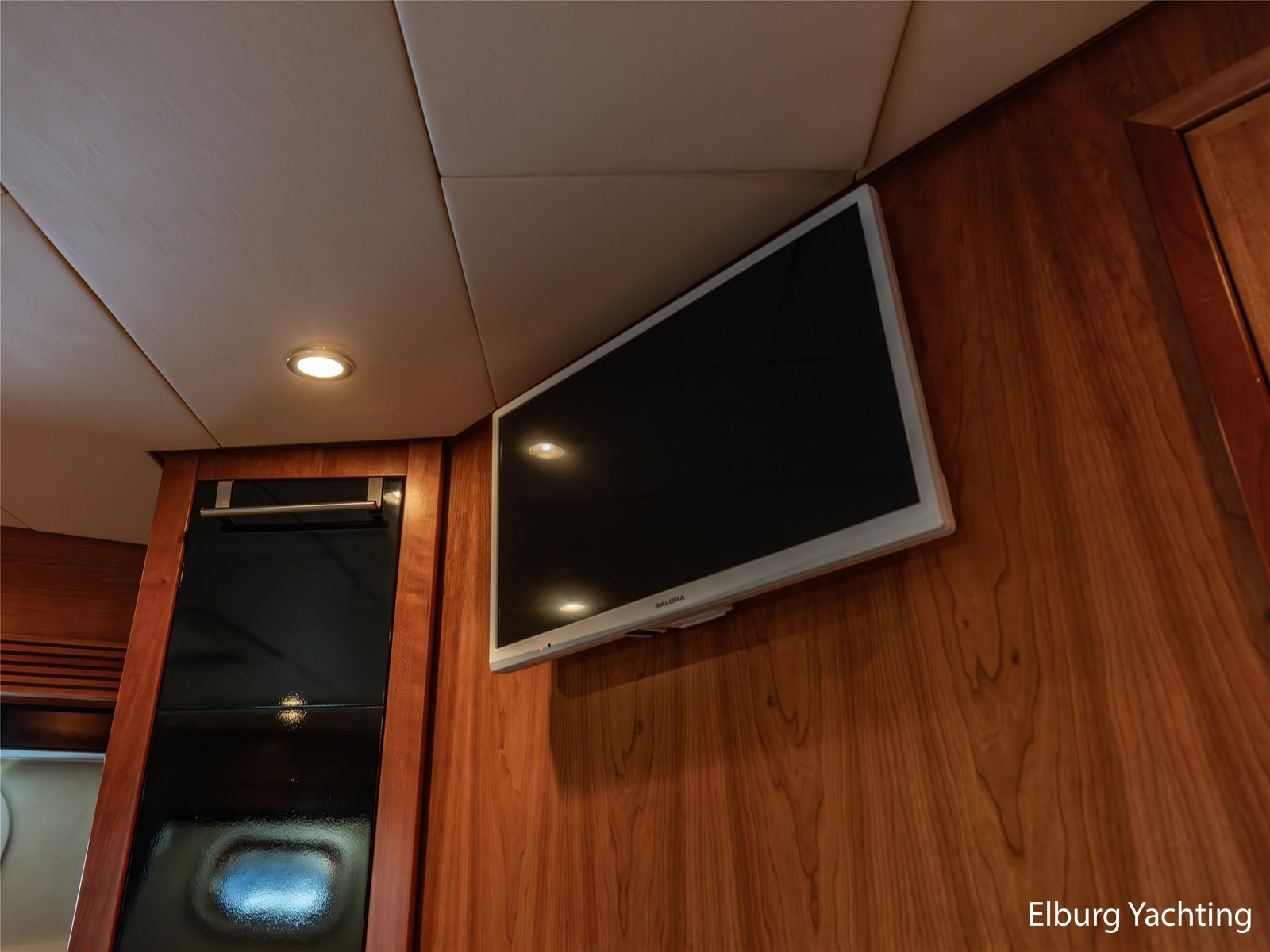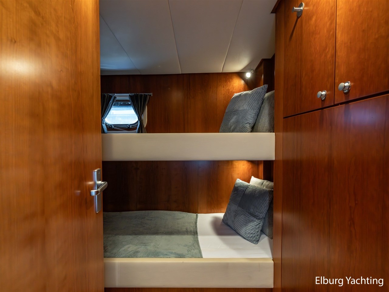 From the wheelhouse, a small level change leads to the spacious salon, finished in teak wood with cream-white leather upholstery and generous natural light from the large windows. The salon is elegantly illuminated with built-in LED lighting and features a flat-screen TV, ensuring relaxation on board. Just a few steps down from the salon, you’ll find the fully equipped galley, featuring a Corian countertop, ceramic cooktop, extractor hood, Bosch oven, combination microwave, and double refrigerator. Everything is in place for full onboard living and cooking.