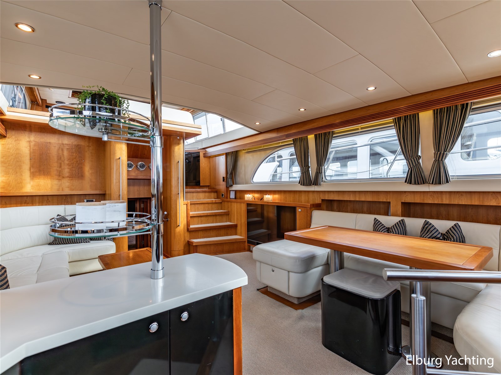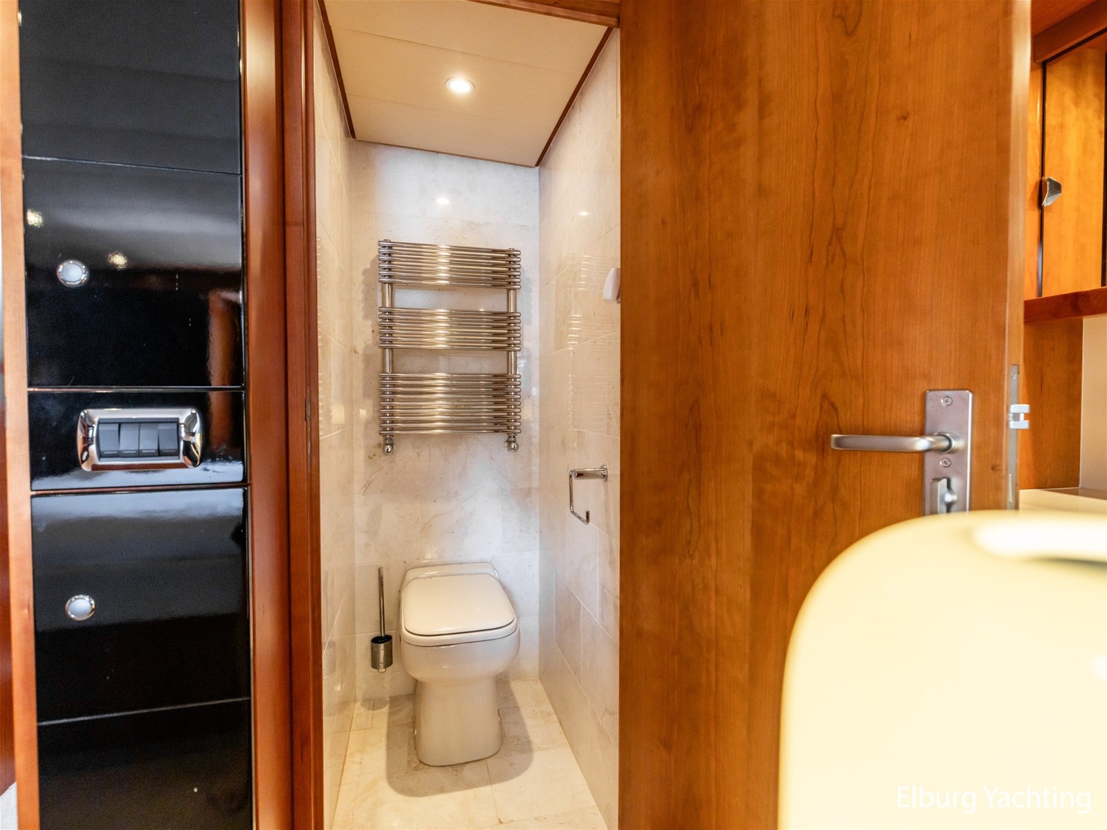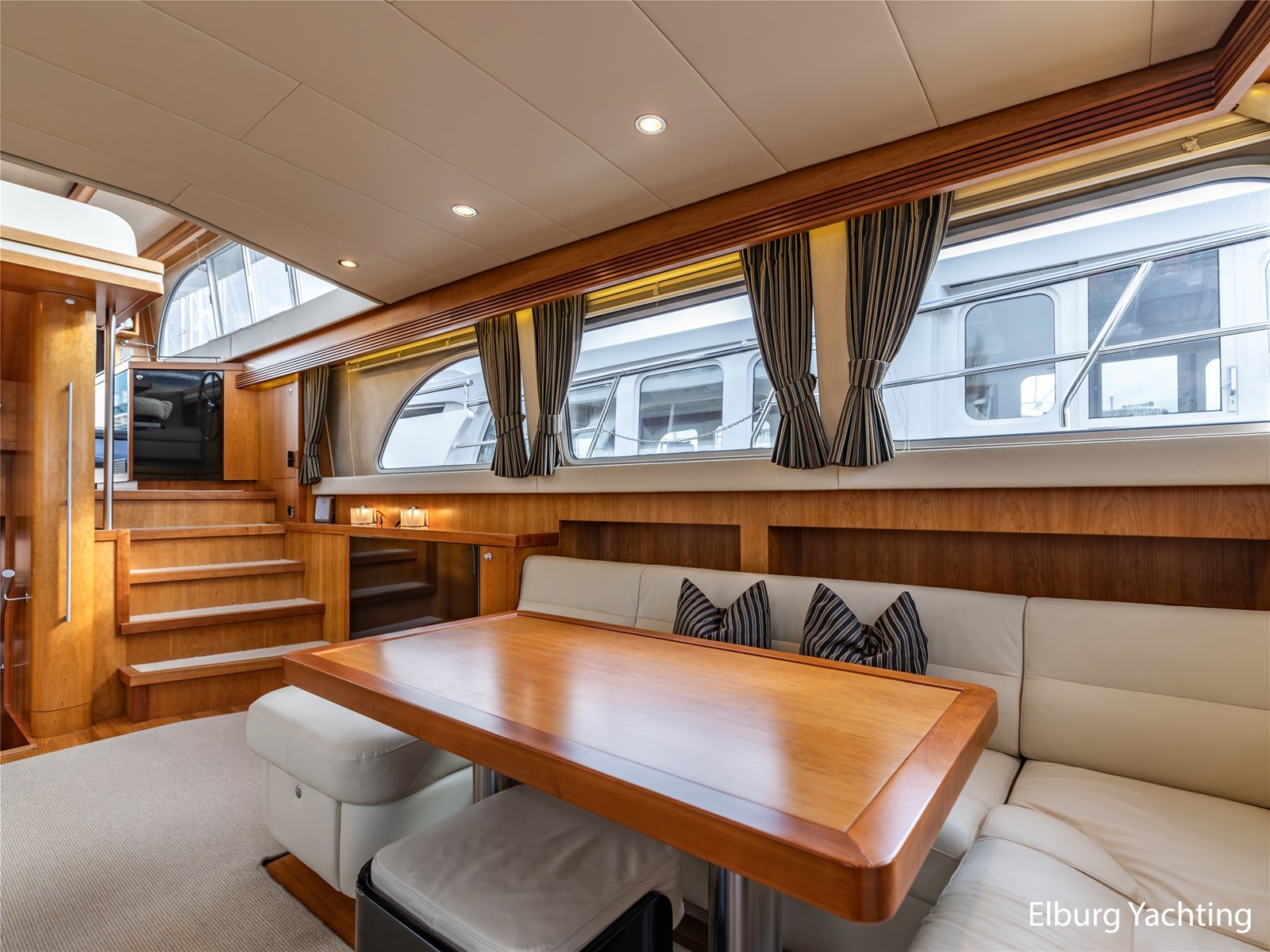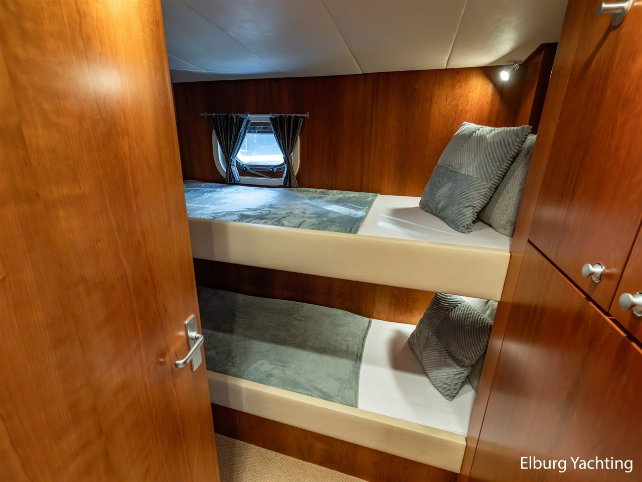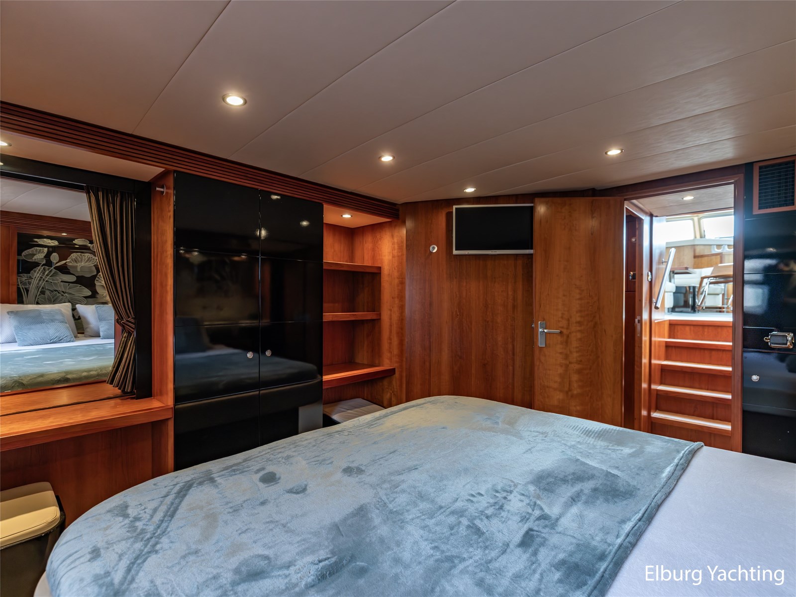 From the wheelhouse, a small level change leads to the spacious salon, finished in teak wood with cream-white leather upholstery and generous natural light from the large windows. The salon is elegantly illuminated with built-in LED lighting and features a flat-screen TV, ensuring relaxation on board. Just a few steps down from the salon, you’ll find the fully equipped galley, featuring a Corian countertop, ceramic cooktop, extractor hood, Bosch oven, combination microwave, and double refrigerator. Everything is in place for full onboard living and cooking.