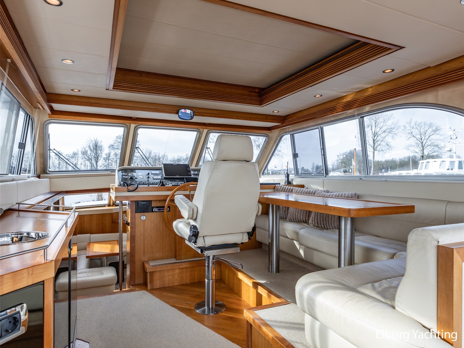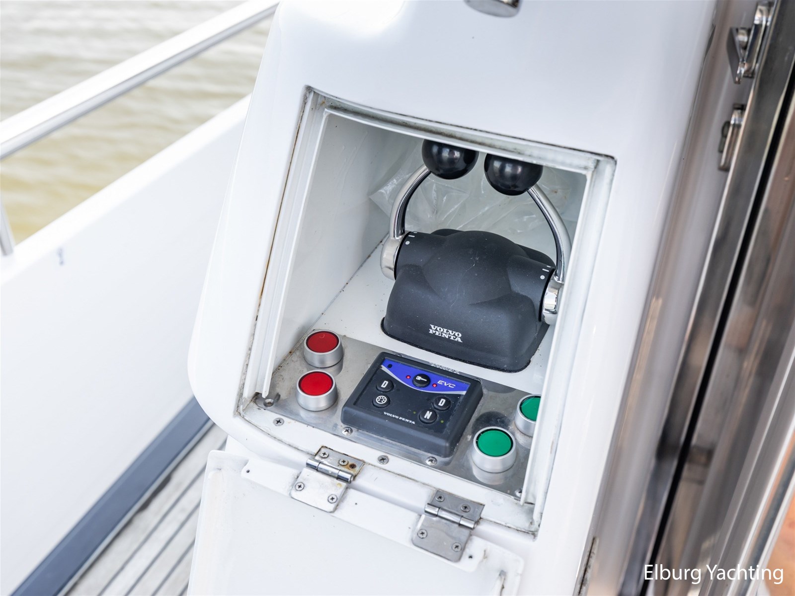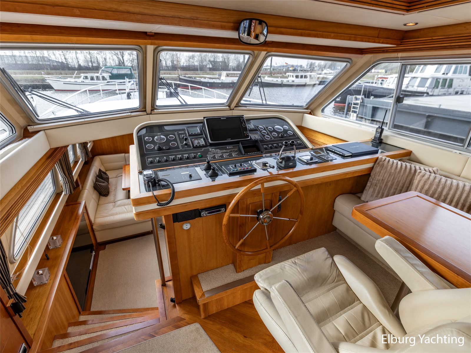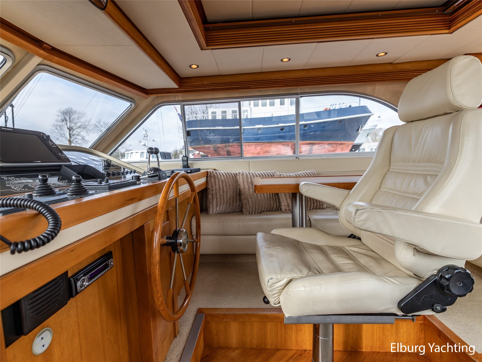 The wheelhouse is fully equipped, including autopilot, radar, chartplotter, camera system, electric searchlight, Hydronautisch remote control for motor, bow and stern thrusters, interval wipers, VHF radio, and other accessories. Everything is in place for both relaxed and safe cruising, regardless of the sailing area.