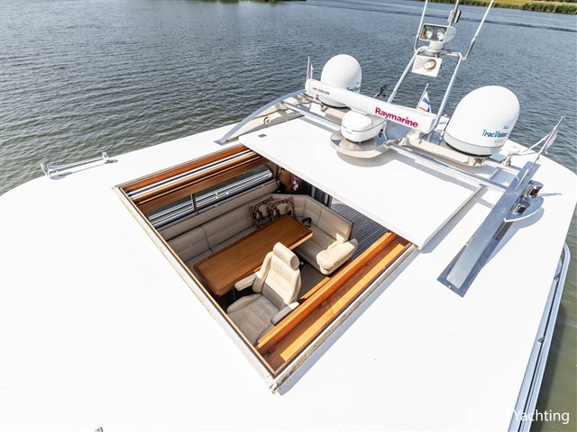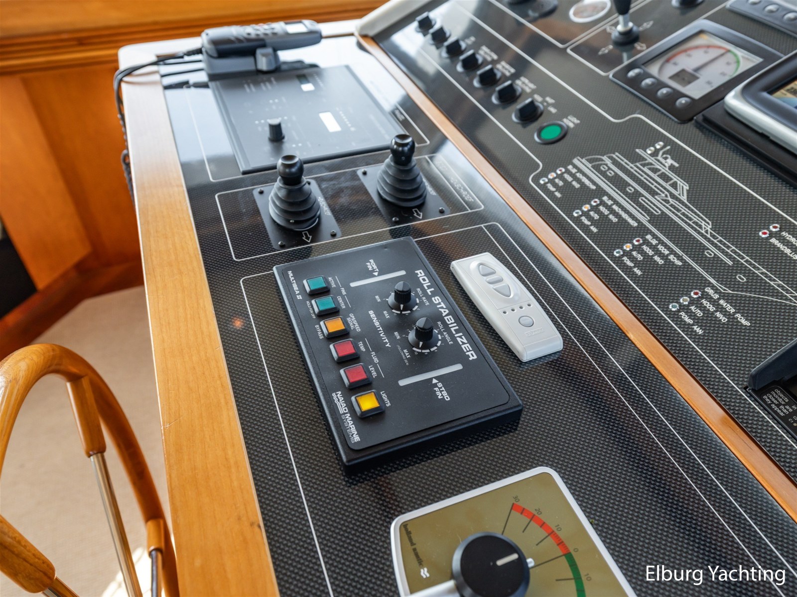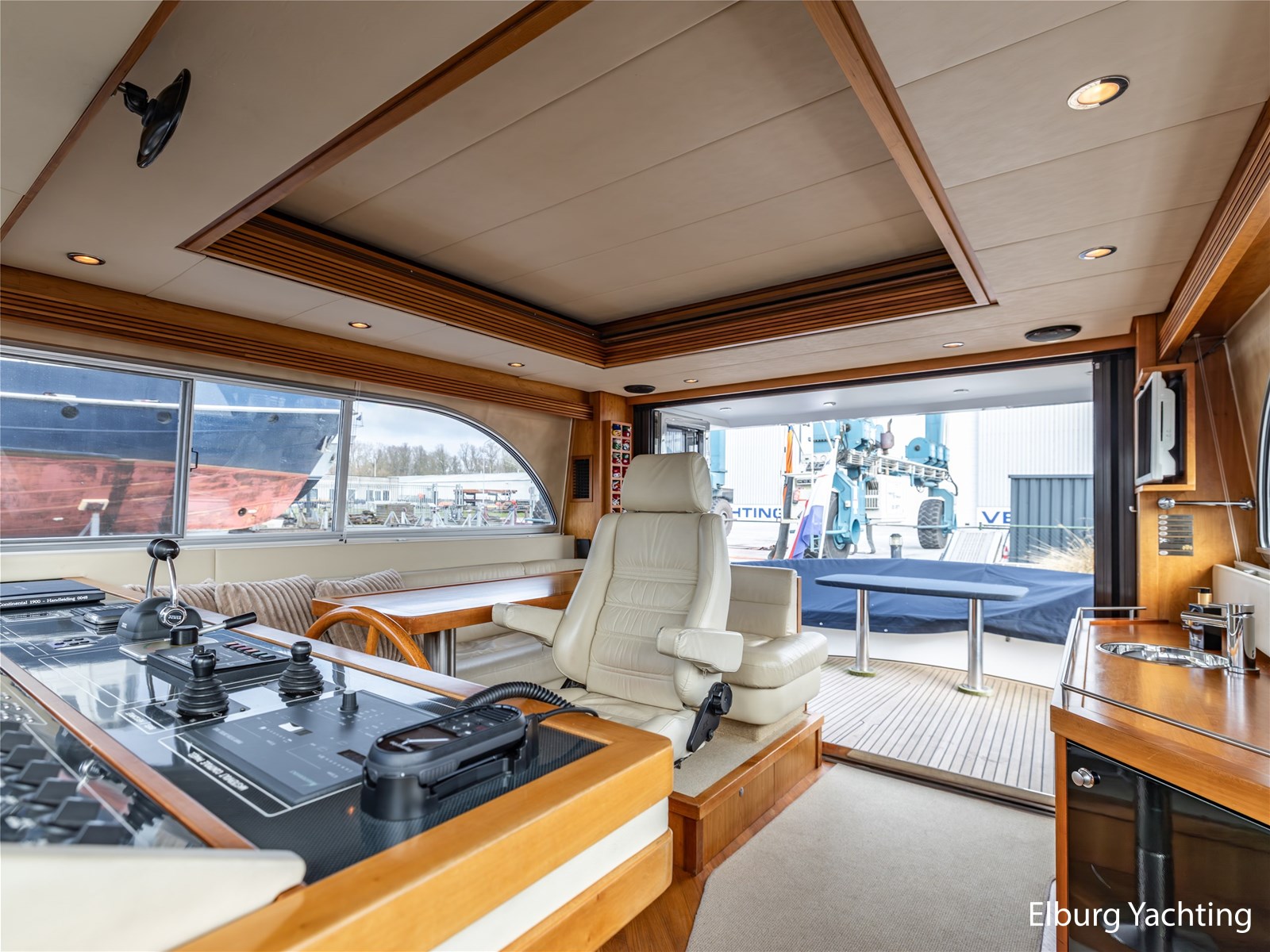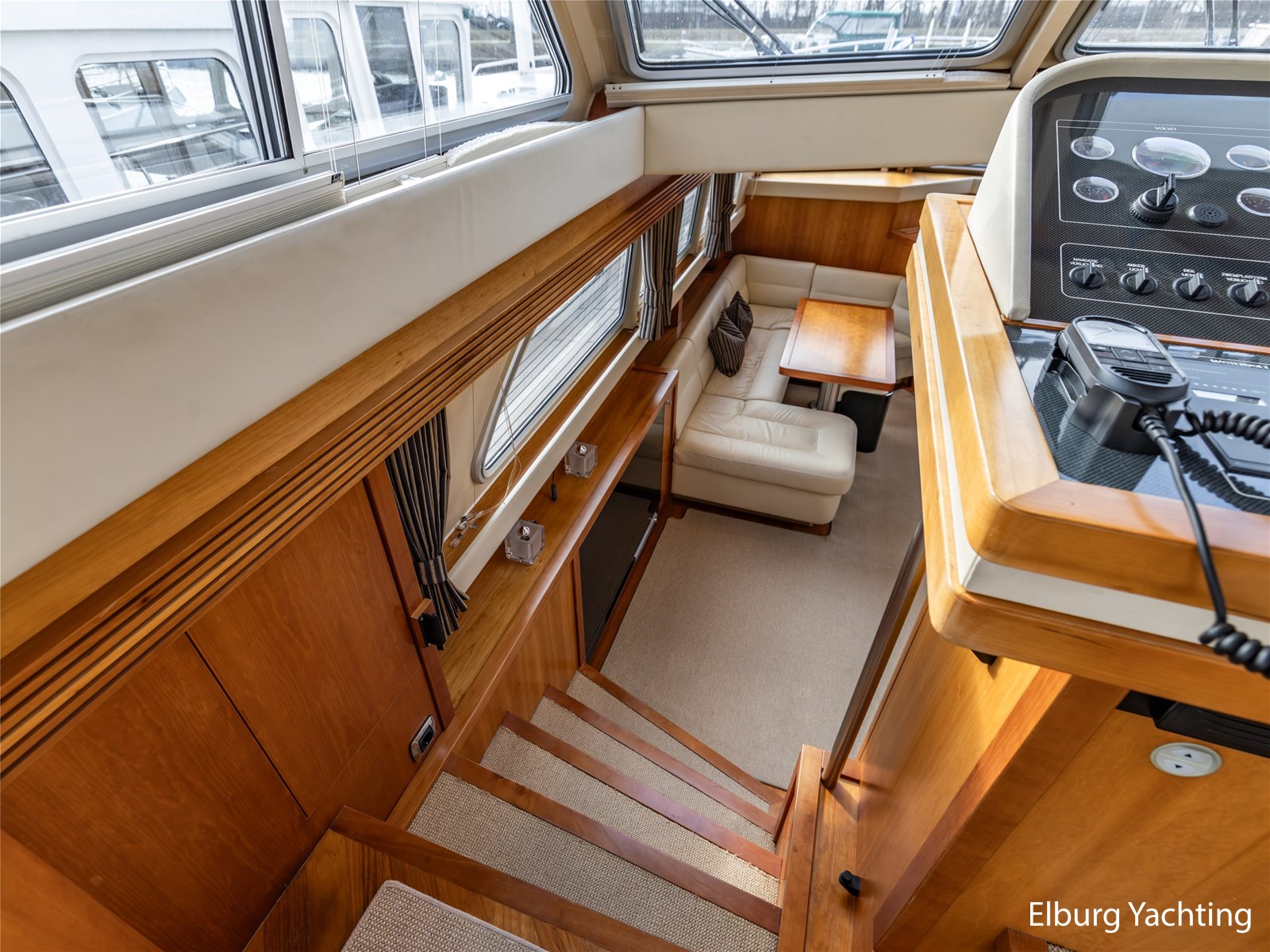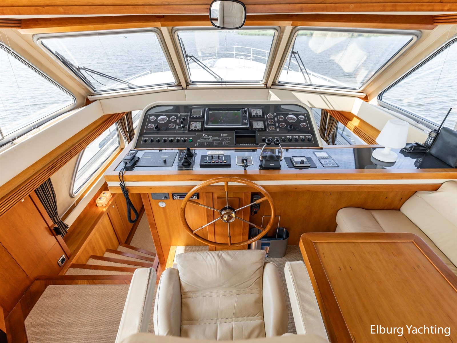 The wheelhouse is fully equipped, including autopilot, radar, chartplotter, camera system, electric searchlight, Hydronautisch remote control for motor, bow and stern thrusters, interval wipers, VHF radio, and other accessories. Everything is in place for both relaxed and safe cruising, regardless of the sailing area.