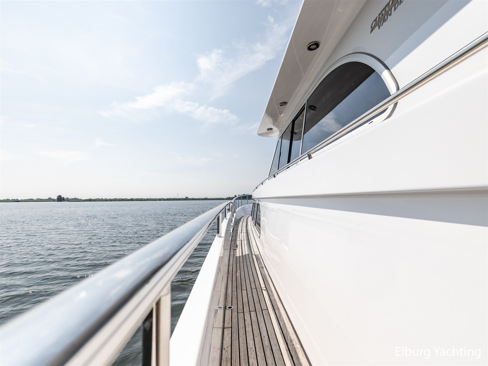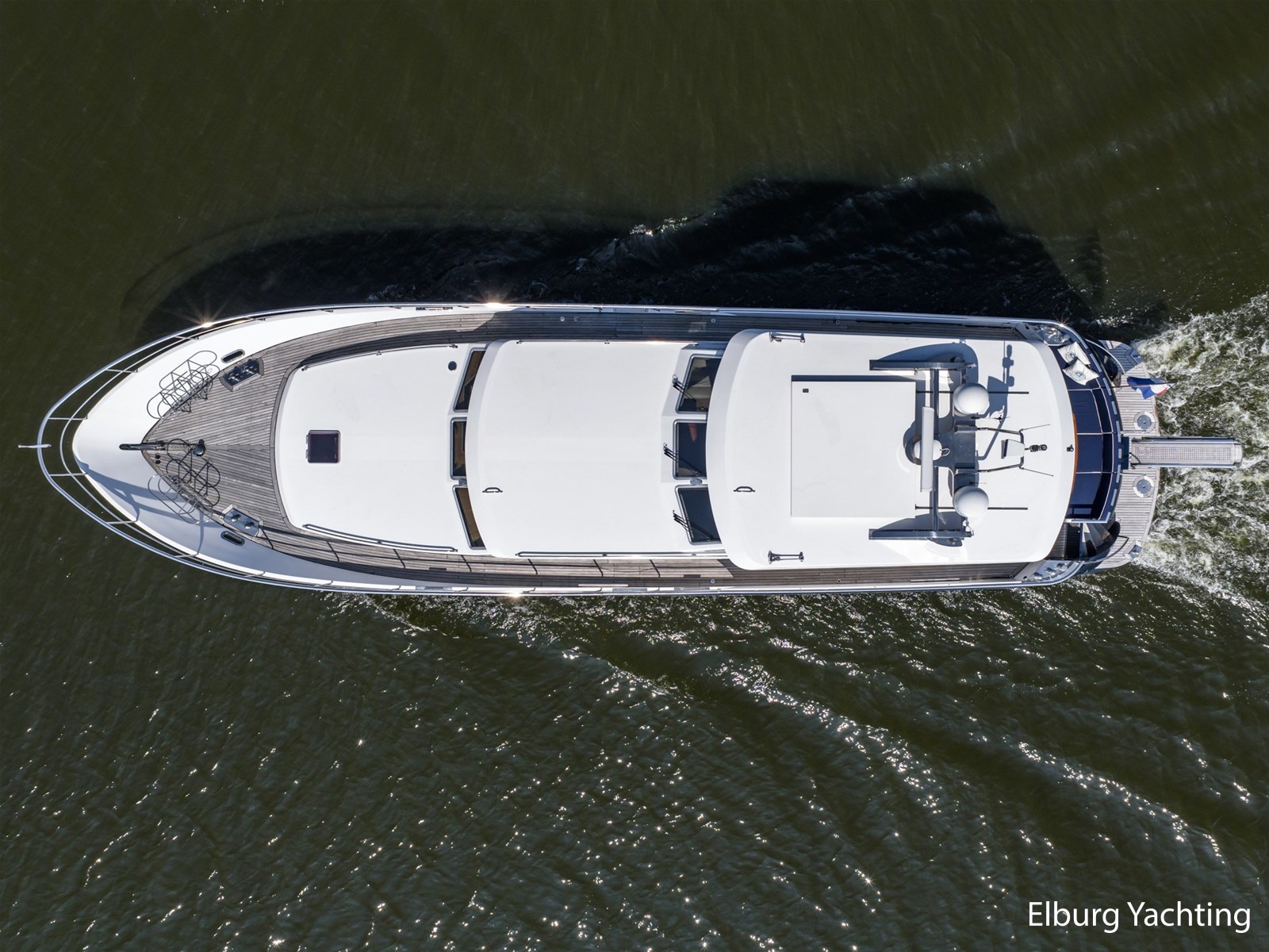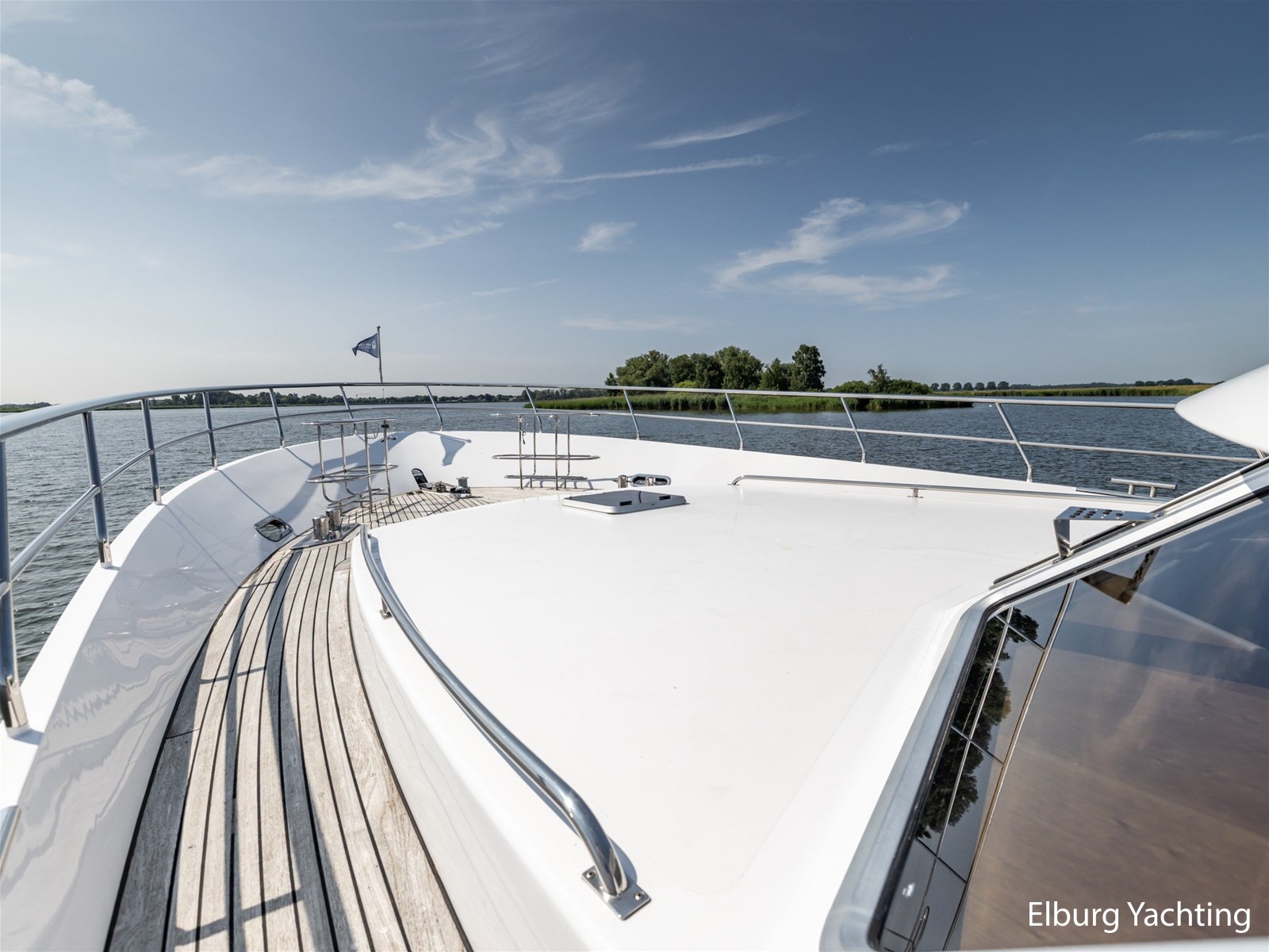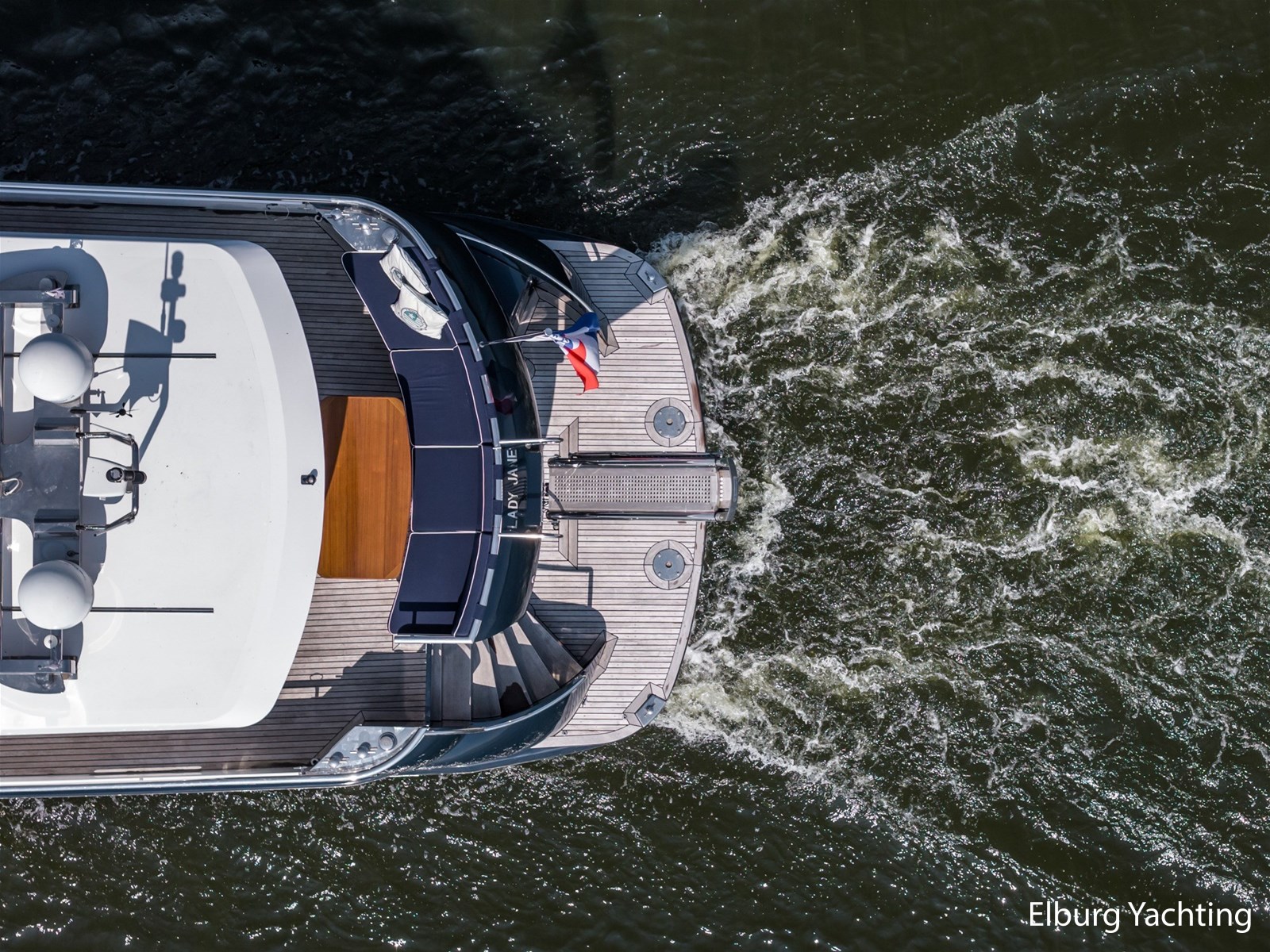 Comfort has also been fully implemented outside. The yacht has a teak deck all around and a large bathing platform with integrated gangway and lighting. A lazy staircase from the aft deck makes access to the bathing platform extra comfortable.