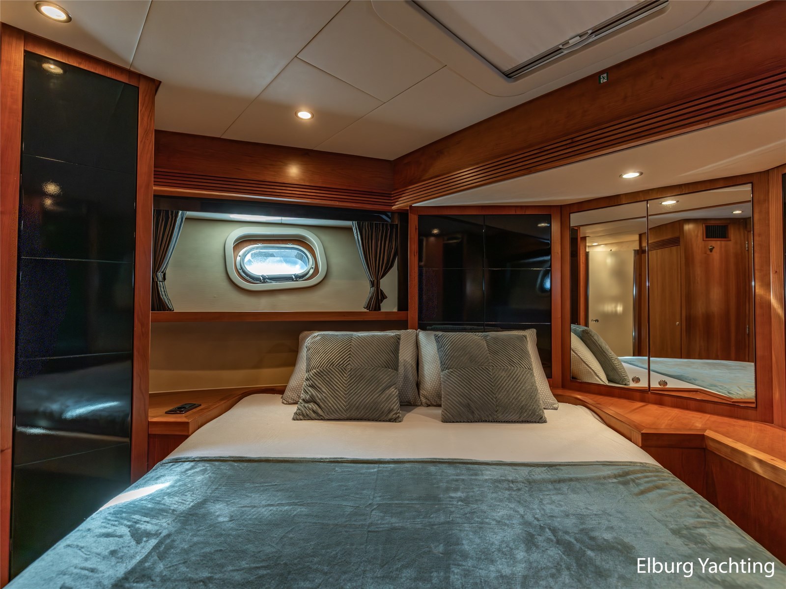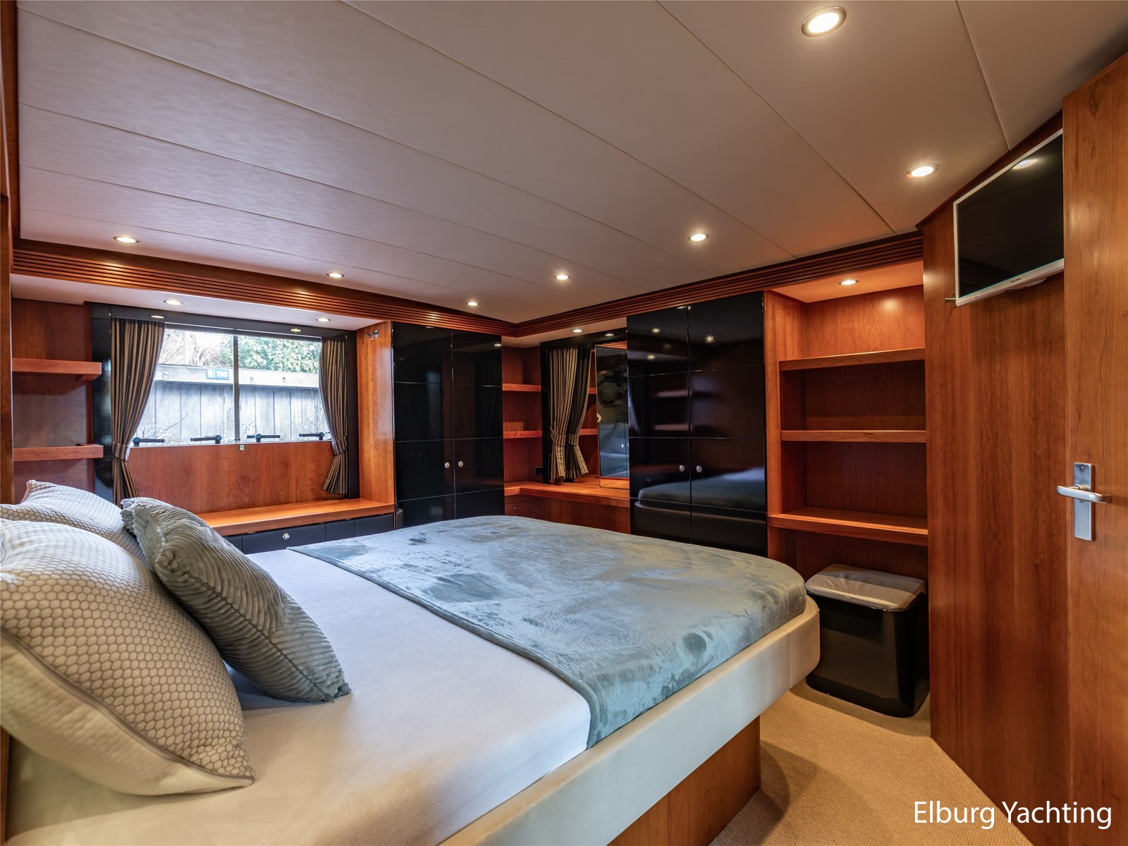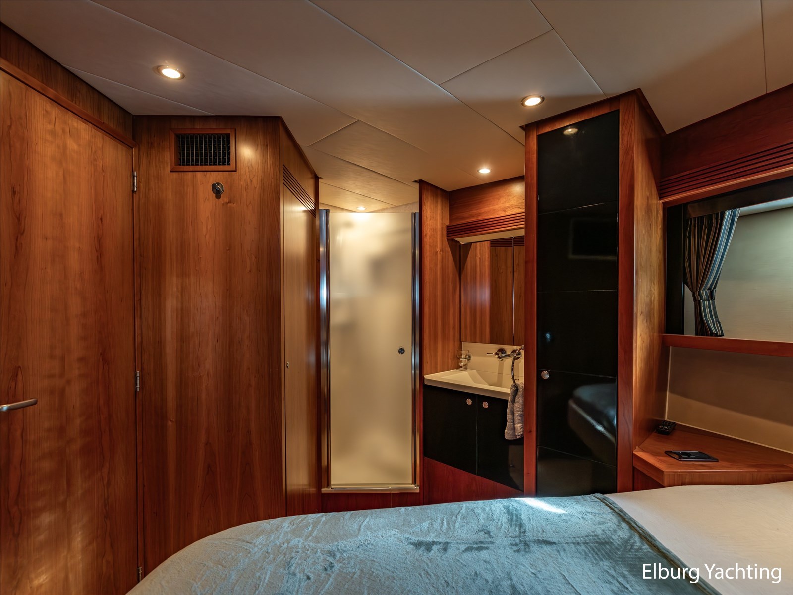 The owner's cabin at the rear is particularly spacious and spans the full width of the yacht. This luxurious full-beam master cabin features a freestanding double bed, an en-suite bathroom, ample closet space, and attractive finishes.