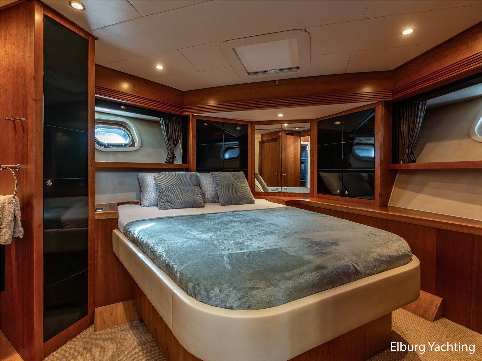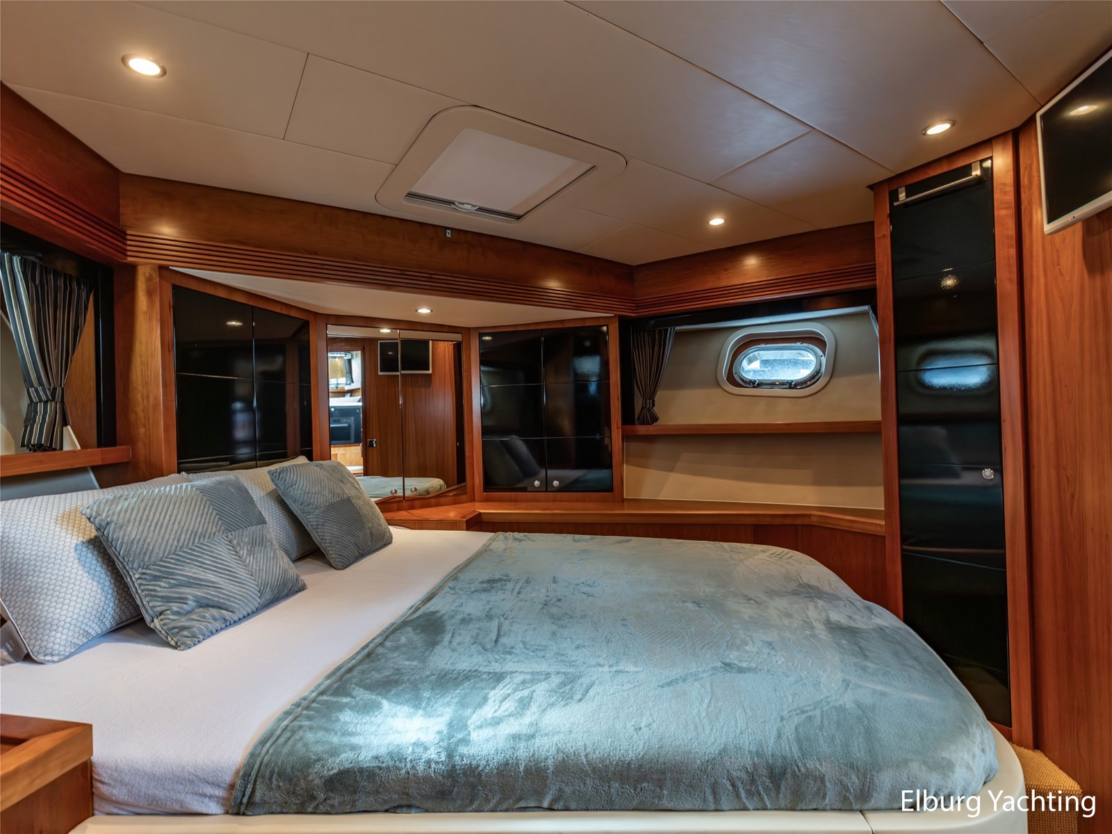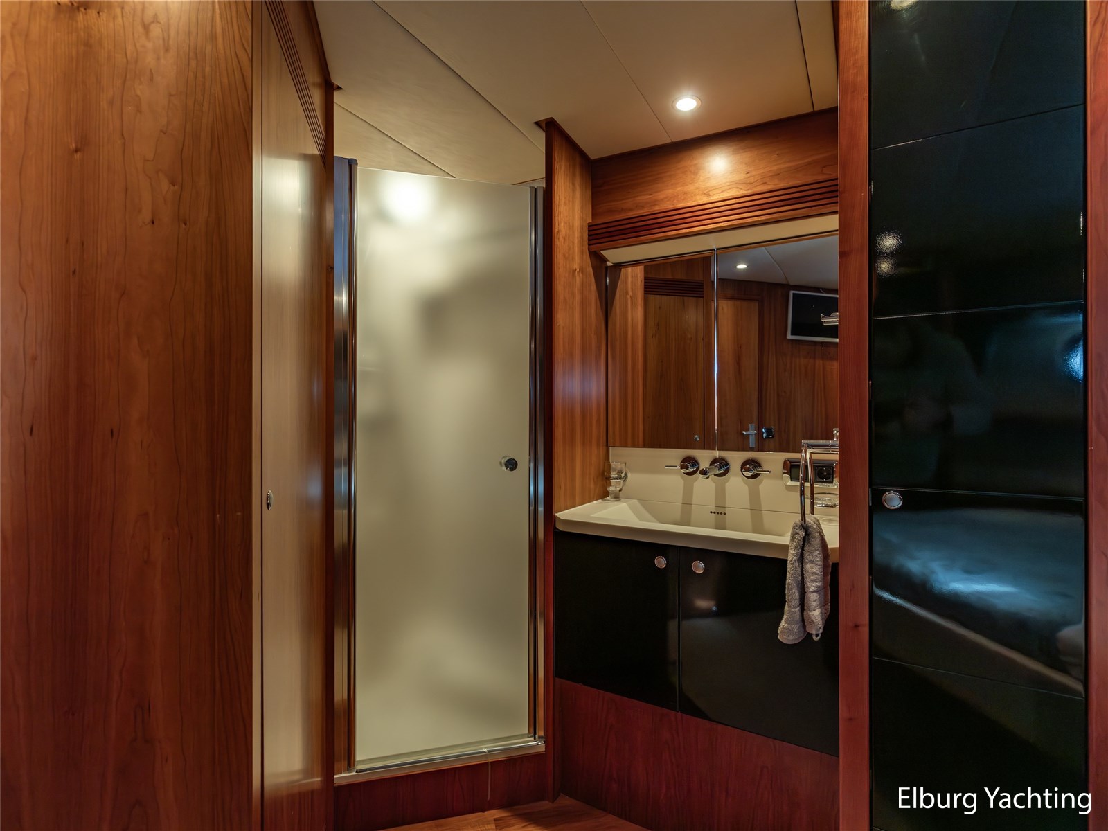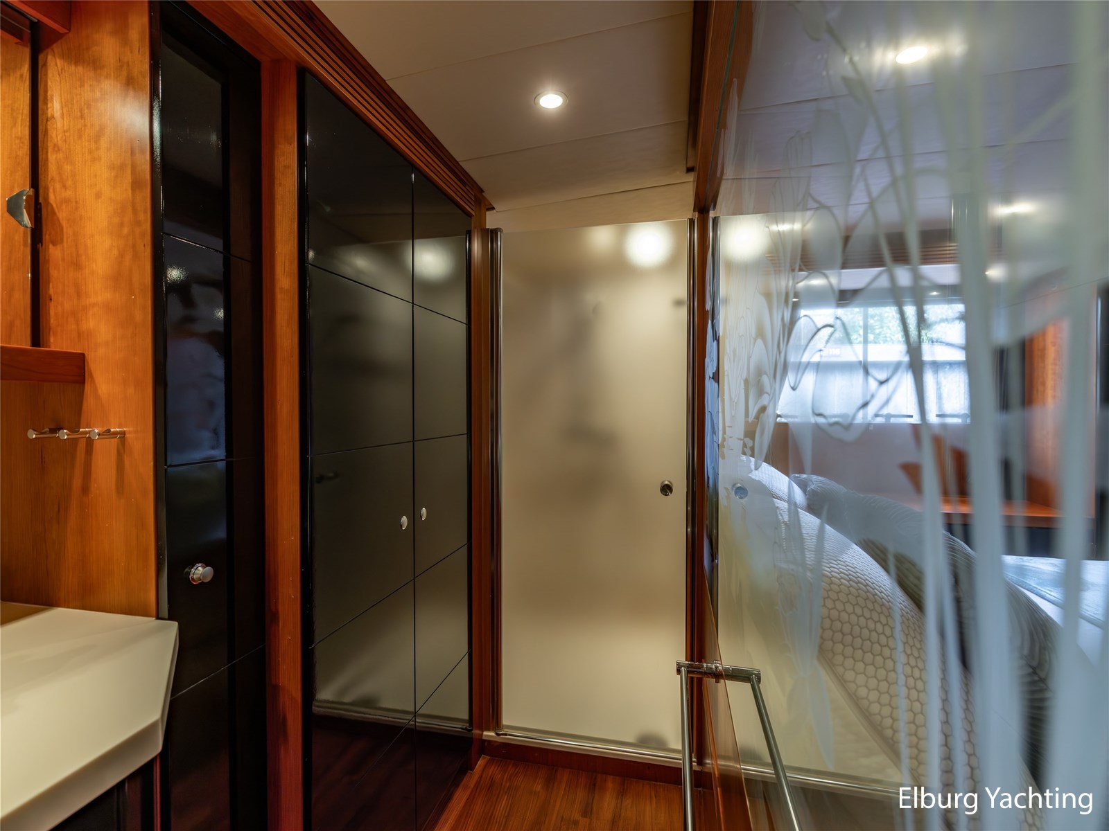 The owner's cabin at the rear is particularly spacious and spans the full width of the yacht. This luxurious full-beam master cabin features a freestanding double bed, an en-suite bathroom, ample closet space, and attractive finishes.